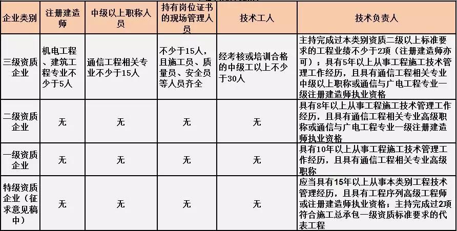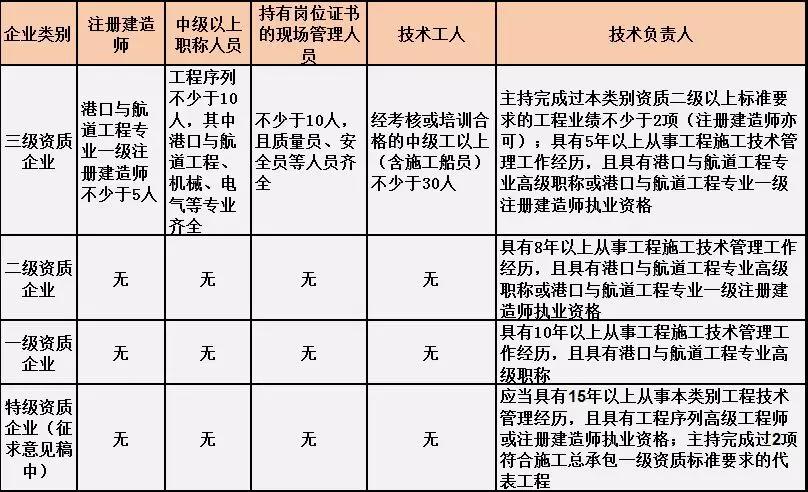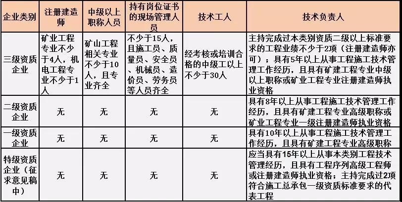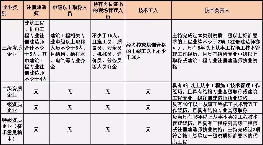 換句話說,并不是所有企業(yè)資質(zhì)都不要求有建造師等企業(yè)人員。施工總承包三級資質(zhì)企業(yè)對建造師等人員仍有要求,一級資質(zhì)、二級資質(zhì)企業(yè)保留技術(shù)負責(zé)人這一項要求,特級資質(zhì)另有規(guī)定。