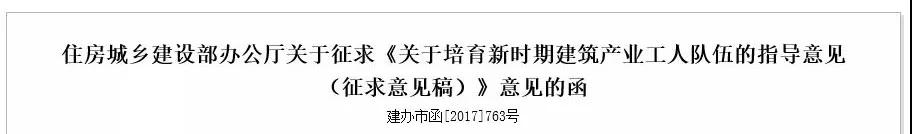 2017年11月,住建部印發(fā)關(guān)于《關(guān)于培育新時期建筑產(chǎn)業(yè)工人隊伍的指導(dǎo)意見(征求意見稿)》(建辦市函[2017]763號)。